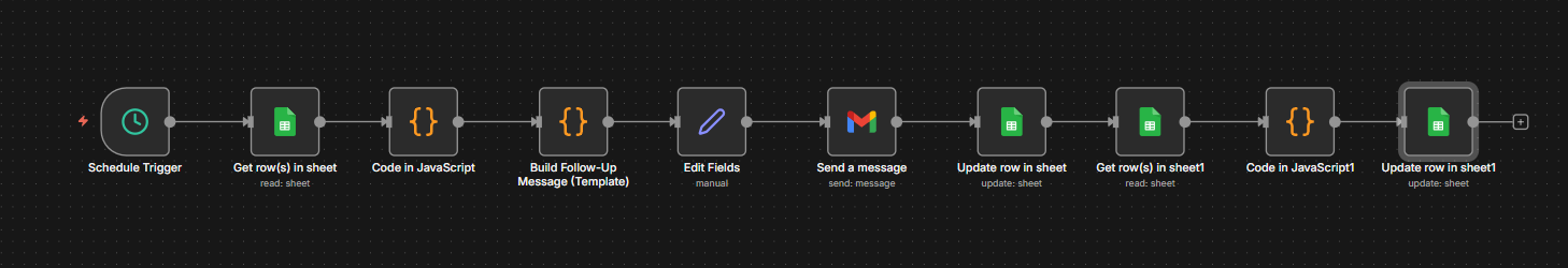 • Sheet Updater: Writes back the follow-up date, message status, and logs the next follow-up cycle.
